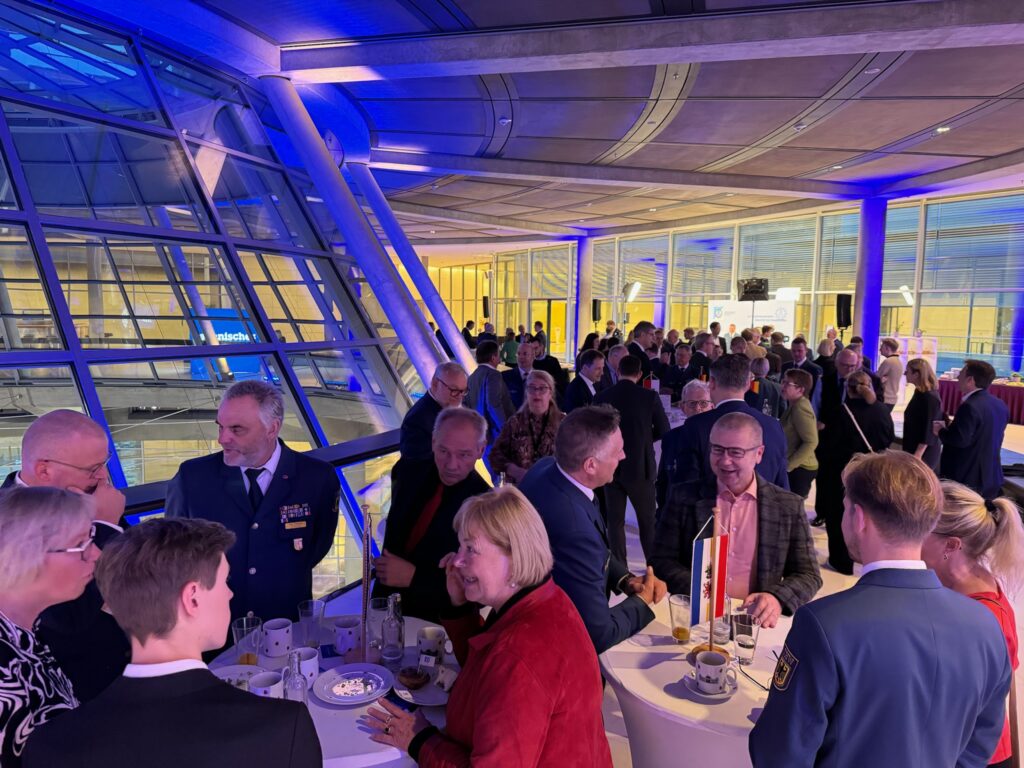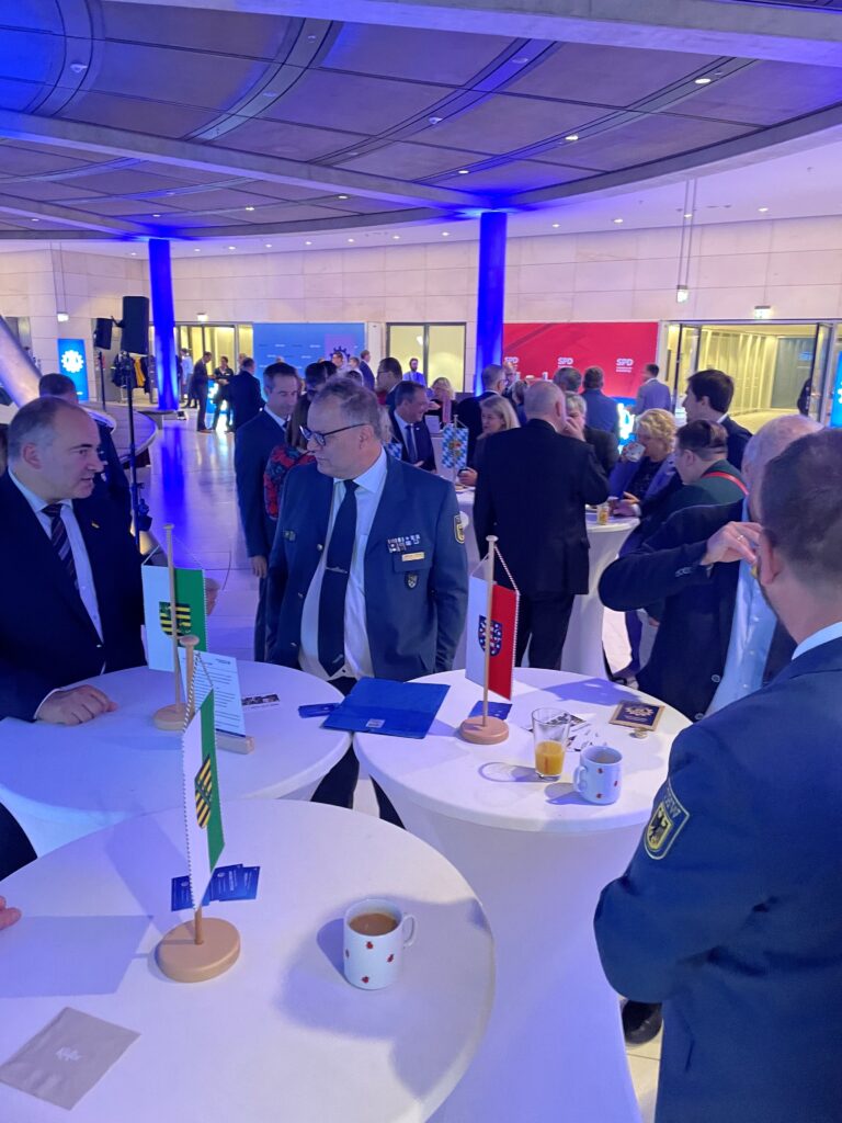 Am 10. Oktober 2024 war es wieder soweit – ab 7 Uhr trafen sich im Reichstagsgebäude in Berlin auf der Fraktionsebene Mitglieder des Deutschen Bundestages und die THW-Familie zum gemeinsamen Frühstück. Der Einladung des THW waren über 300 Abgeordnete gefolgt, mehr als in den Vorjahren. Bei bester Organisation und sehr guter Stimmung kam es zu einem regen Austausch mit den Abgeordneten des Deutschen Bundestages. Dabei wurden die verschiedensten Themen erörtert und viele Fragen beantwortet, u.a. zu Einsätzen und Strukturen des THW, der Helfer- sowie Nachwuchsgewinnung oder der Ausstattung. So konnten auch die für das THW wichtigen Themen wie notwendiges Budget im Haushaltplan für das THW, erforderliche Technik oder den Liegenschaftsbedarf den Abgeordneten vermittelt werden. Auch am Tisch des Landesverbandes und der Landesvereinigung Sachsen Thüringen gab es rege Diskussionen mit den beiden Landessprechern Andreas Heinrich und Michael Richter sowie dem stellvertretenden Landesbeauftragten Martin Wolter und dem Vorsitzenden der Landesvereinigung Sachsen Thüringen Udo Stöckel.
